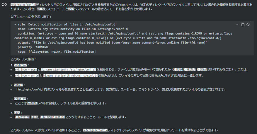 Falcoルールの作成例とcondition句の詳細を教えてくれました。検知したいイメージ通りのFalcoルールであるように見えます。