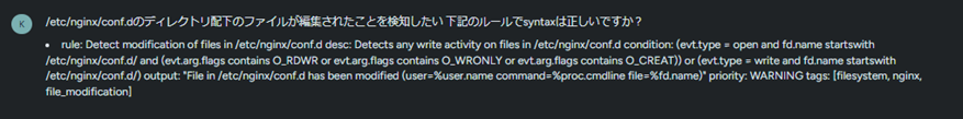Sageを利用することで自分の作成したいFalcoルールの例を教えてくれるのはありがたいですね。また作成例の詳細な情報も教えてくれるので勉強がはかどりそうです。ただし、教えてくれた情報はoutput句などの情報が少ないので、本番で利用するためにはもう少し修正が必要そうでした。