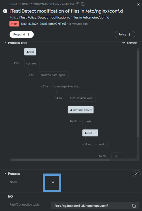 下画像の通り、vimコマンドでファイル編集したことを検知しました(下図青枠)。