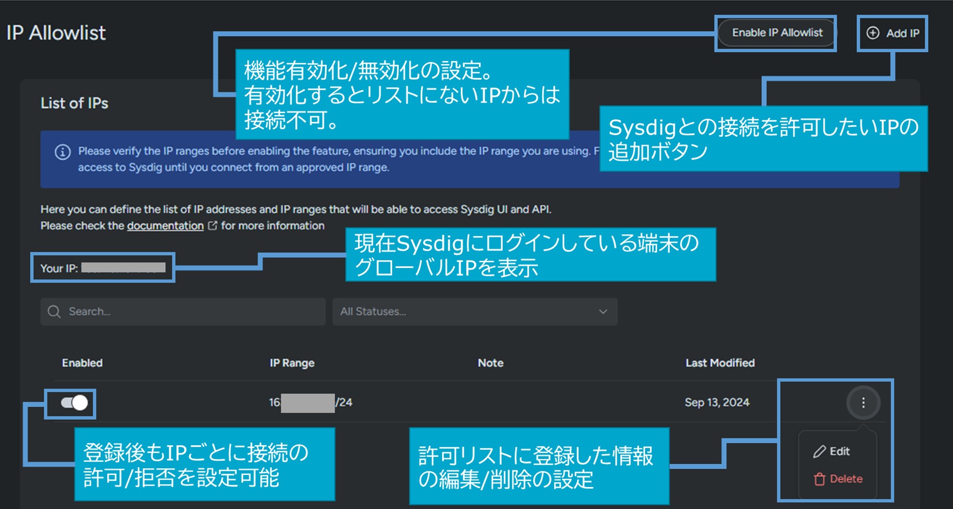 SysdigのGUIおよびAPIへアクセスするグローバルIPアドレスを制限する機能です。 IP Allowlistを有効にすると、IP許可リストに登録したグローバルIPアドレス以外の通信は拒否されます。 ※機能の設定を誤るとSysdigにアクセスできなくなりますのでご注意ください。 設定画面では次の操作が実行できます。
